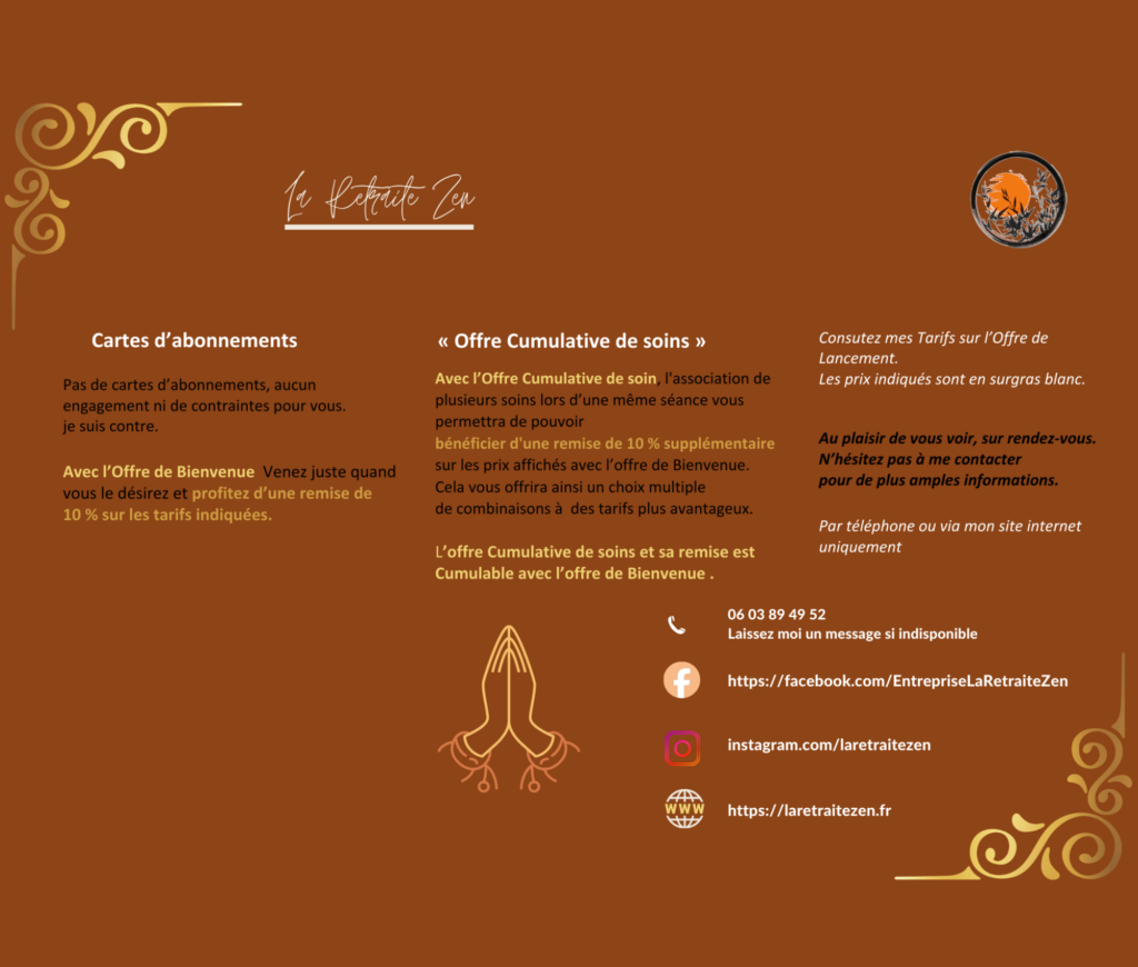 et profitez de 10 euros de réduction sur tout soin d’une heure ou plus lors de votre prochaine séance, cumulable avec nos offres existantes ( voir onglet Mes Tarifs )